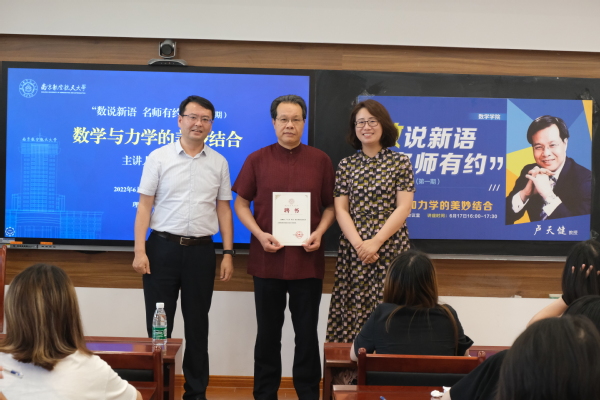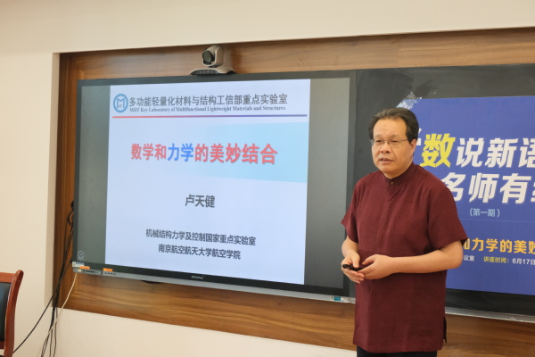 6月17日,日韩av 在理学楼519会议室举办第一期“数说新语,名师有约”讲座交流活动。国家级人才、多功能轻量化材料与结构研究中心主任、航空学院教授卢天健做了题为《数学和力学的美妙结合》的专题讲座。日韩av 党委书记许静、院长王春武、院党委副书记周佼佼、辅导员以及日韩av 、物理学院约40名同学参加活动。活动由周佼佼主持。