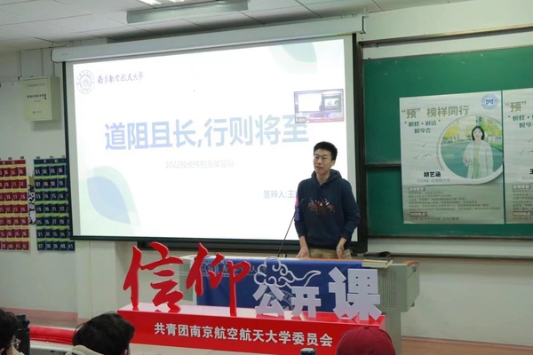 2018级少数民族预科班结业生王增茂首先进行了分享。他讲述了以预科生身份开启大学、不断成长进步的故事。他回忆到,几年前的自己也坐在这个教室进行学习。预科一年的学习生活给他留下了温暖且充实的记忆,同时为他的本科学习打下了坚实的基础。他鼓励学弟学妹们珍惜预科阶段的宝贵时间,一起学习、团结奋斗、共同进步。他还分享了参加了科创和竞赛的经历。王增茂本科阶段在自动化学院就读,目前已保研至中国科学院自动化研究所。