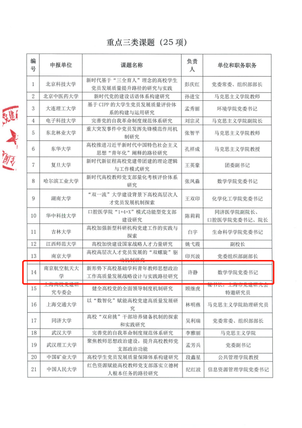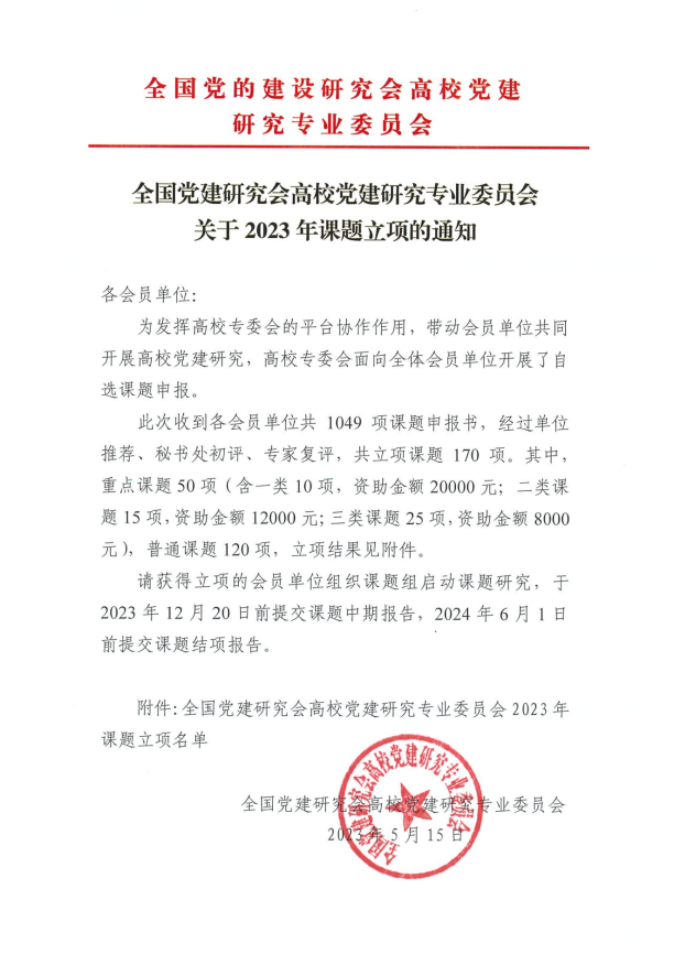 近日,全国党建研究会高校党建研究专业委员会发布了《全国党建研究会高校党建研究专业委员会关于2023年课题的通知》,经过单位推荐、秘书处初评、专家复评,日韩av 申报的《新形势下高校基础学科青年教师思想政治工作高质量发展战略设计与实践路径研究》获重点三类课题(25项)立项。
