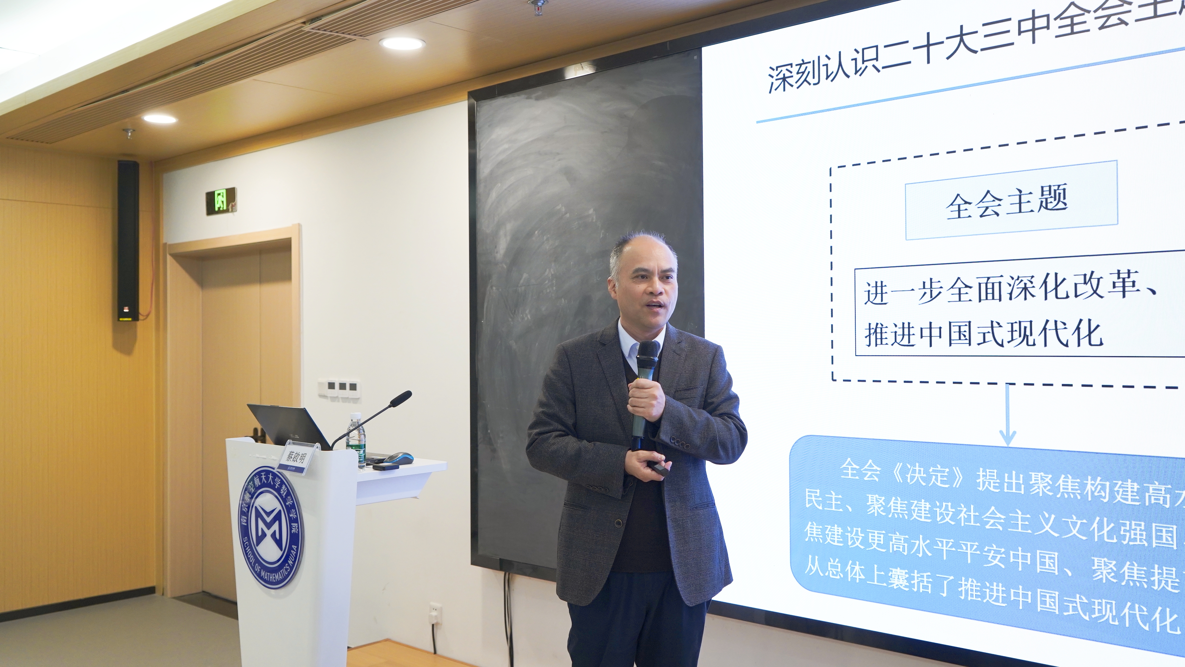 为深入学习贯彻党的二十届三中全会精神,根据校党委统一部署,11月19日,日韩av 举行学习宣传党的二十届三中全会精神校内宣讲团报告会,邀请校内宣讲团成员、经济与管理学院教授蔡啟明作专题辅导报告。学院领导班子成员、师生党员代表近百人参加报告会。报告会由学院副院长龚跃政主持。