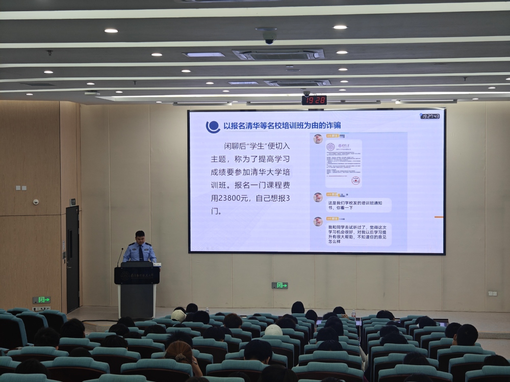 为有效提升学生对电信网络诈骗的识别和防范能力,营造安全和谐的校园环境,5月14日晚,日韩av 在天目湖校区牧星楼T2110教室举办“天目护航”防诈安全教育专题讲座。古县派出所民警兼日韩av 法制辅导员鲍力主讲,学院党委副书记王亚鹏、2024级辅导员赵美婷、迪丽以及2024级全体本、预科生到场参加。