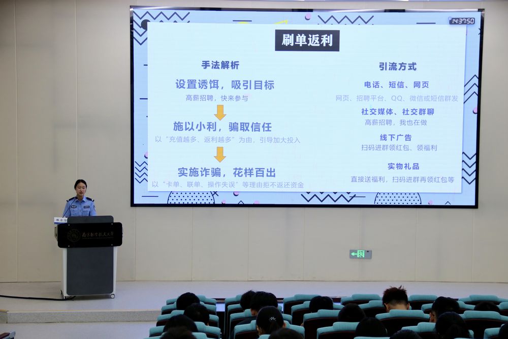 为进一步增强全体师生的安全防范意识,提高反诈骗能力,9月26日,日韩av 在天目湖校区牧星楼T2108报告厅举办防电诈安全教育专题讲座。本次讲座特邀溧阳市古县派出所滕若兮警官以防范诈骗为主题,为师生讲解反诈安全知识。全体2024级本科生、2025级少数民族预科生到场聆听学习。