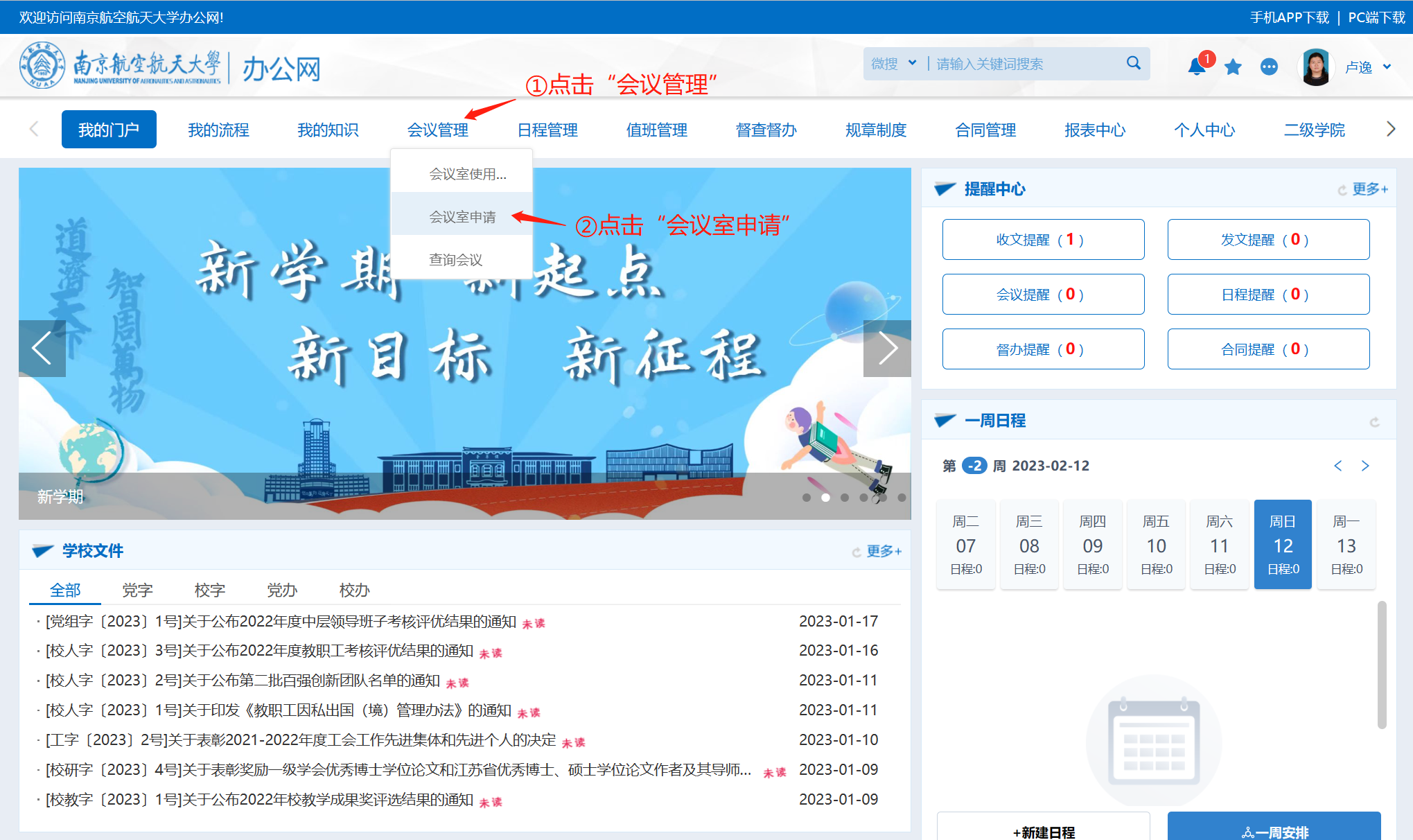注:点击“会议室使用情况”可查看各个会议室的借用情况,可自行选择参会人员并设置会议提醒,提醒消息会推送至参会人。